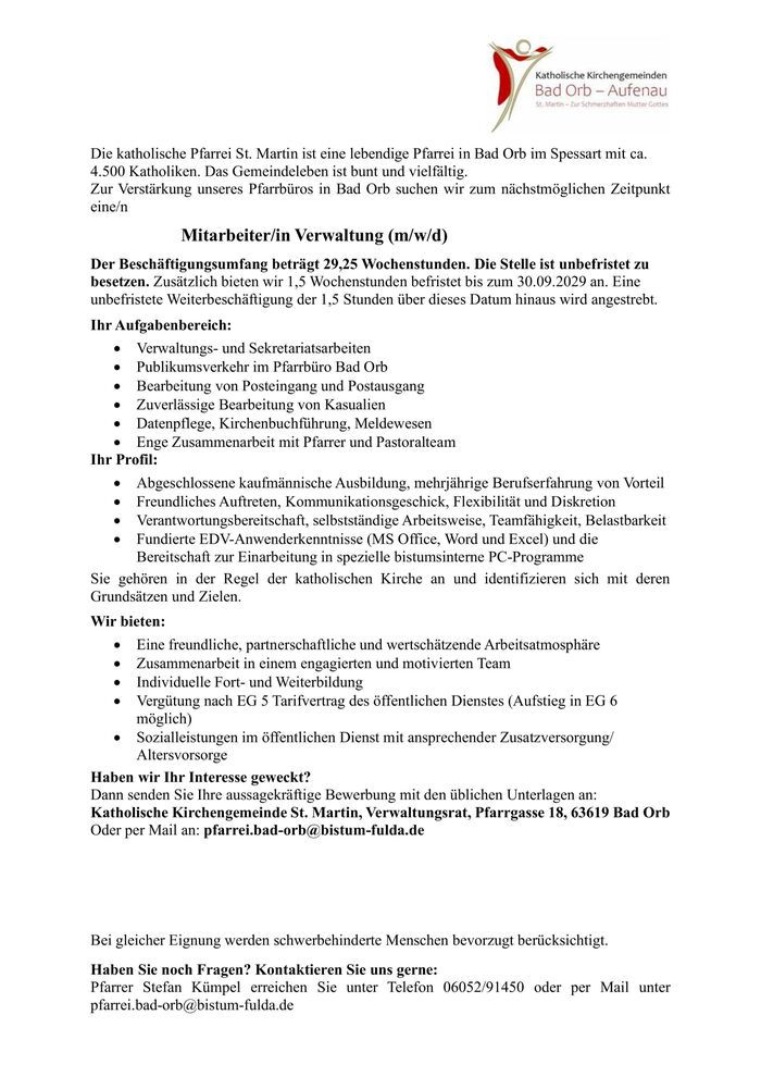 Die Pfarrei Schmerzhafte Mutter Gottes in Aufenau ist eine eigenständige Gemeinde, die von der Pfarrei Bad Orb mitbetreut wird.