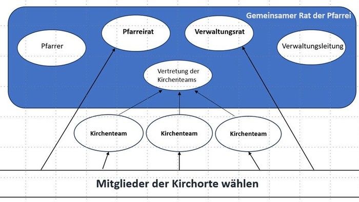 Die erste Wahl der neuen zentralen Gremien soll innerhalb des ersten halben Jahres nach Zusammenschluss der neuen Pfarrei erfolgen. Neben den direkt gewählten können auch weitere Mitglieder in die Gremien berufen werden. Davon ist insbesondere Gebrauch zu machen, wenn nach der Wahl noch nicht alle Kirchorte in den Gremien vertreten sind. Der gemeinsame Rat (oben in blau dargestellt) ist eine Zusammenkunft der verschiedenen Gremien zur Beratung über besondere strategische Themen.