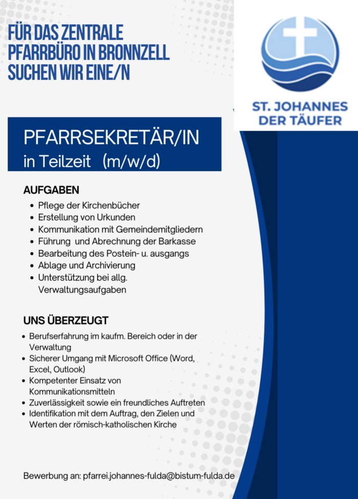 Für die neue Pfarrei wird in Bronnzell ein zentrales Pfarrbüro eingerichtet. Bitte beachten Sie die Veröffentlichungen, ab wann dieses in Betrieb ist. Bis dahin gelten die bisherigen Öffnungszeiten vor Ort.