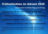 Beginnend mit dem 6. Dezember in der Kapelle des Ursulinenklosters, einer Frühschicht am Freitag, 12. Dezember schon um 6 Uhr in Gudensberg und zwei weiteren in der URS bereiten wir uns wieder in dieser besonderen Weise auf Weihnachten vor. Und die Gemeinschaft soll nicht zu kurz kommen ;-).