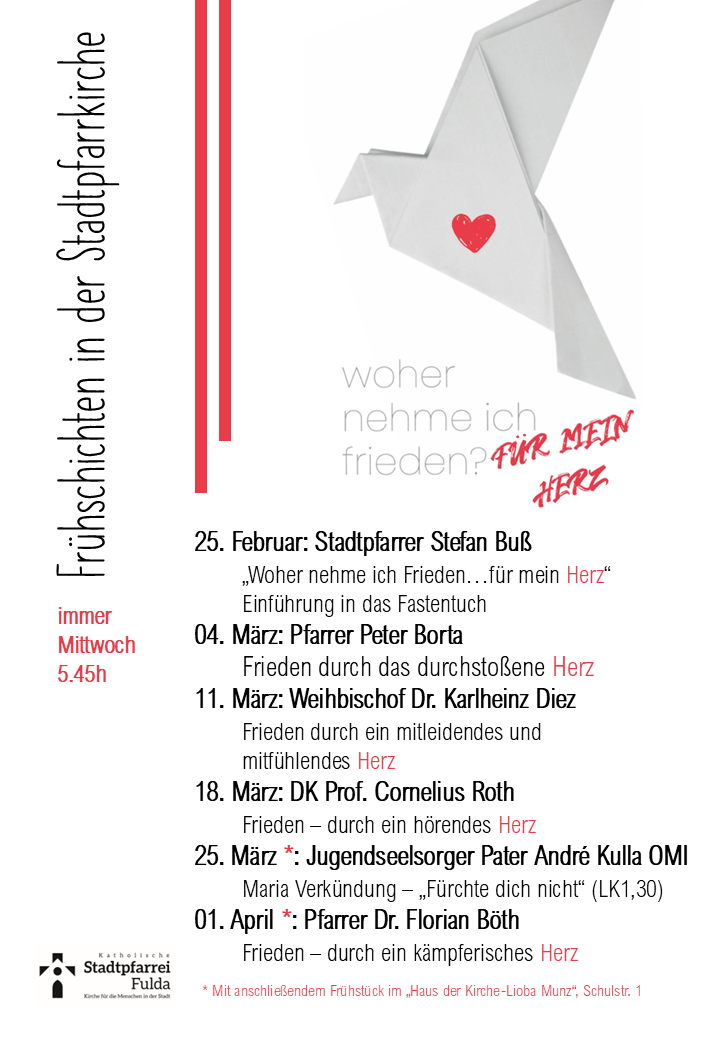Gott, unser Vater, wir sind deine Kirche hier am Ort in der Innenstadt von Fulda. Wir sind als dein Volk, deine Gemeinde unterwegs in eine neue Zeit. Wir haben unsere Vergangenheit mit Licht und Dunkel, doch du warst und bist immer unser Gott.