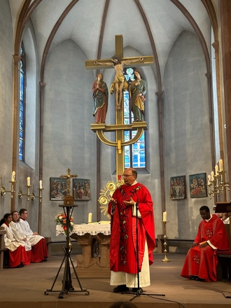 Ein wunderbares Fest in Steinheim, und das seit Jahrhunderten am zweiten Sonntag im September. „Im Kreuz ist Heil. Im Kreuz ist Leben. Im Kreuz ist Hoffnung, so steht es in großen Buchstaben an der Wand in der Kreuzkapelle. Jedes Jahr besuchen wir die Gnadenkapelle auf einer Radtour mit den Messdienern und am Kreuzfest zu Fuß mit der Wallfahrtsgruppe aus Kesselstadt. Das Kreuz ist die Brücke über den Main von Kesselstadt nach Steinheim und dann sogar zum Himmel!“, so Dechant Andreas in seiner humorvollen Predigt. Weber dachte mit den zahlreichen Gläubigen über den Grund christlicher Hoffnung nach und erinnerte an das Heilige Jahr 2025 mit Leitwort „Pilger der Hoffnung“: „Der Glaube bietet eine Hoffnung, die überhaupt nicht stirbt, auch nicht zuletzt. Durch den Tod und die Auferstehung Jesu wird wir diese Hoffnung erfüllt. Für jeden von uns! Lassen wir uns deshalb – auch von widrigen Umständen und schlechten Prognosen - nicht aufhalten, auf gutem Weg weiter zu gehen. In der Gemeinschaft der Kirche als „Pilger der Hoffnung“ - Der Regen am Morgen hält den Pilger nicht auf! Uns auch nicht!“ – rief Weber den Gläubigen zu.