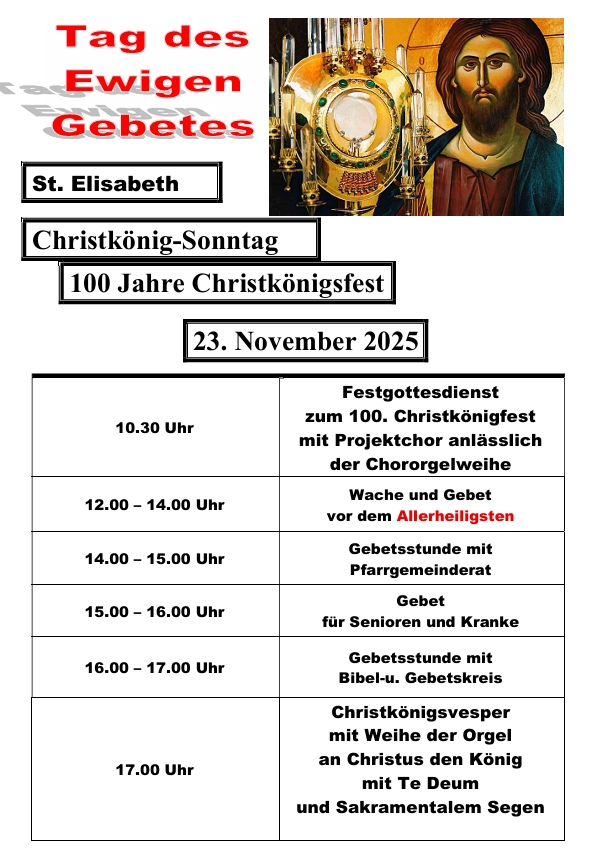 Am Sonntag, dem 23. November wird die neue Chororgel in zwei feierlichen Gottesdiensten als liturgisches Begleitinstrument erklingen. In der hl. Messe um 10.30 Uhr wird ein Projektchor Teile aus der im Jahr 1911 komponierten „Missa in honorem St. Caeciliae“ des Genfer Komponisten William Montillet singen. Um 17 Uhr findet die Vesper zum Abschluss des Ewigen Gebets statt. In diesem Rahmen wird die Schola St. Elisabeth – begleitet von der neuen Chororgel – gregorianische und andere liturgische Gesänge singen.