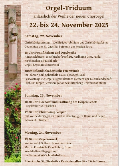 Am Samstag, dem 22. November um 18 Uhr wird in der Pfarrkirche St. Elisabeth (Kastanienallee 68, 63454 Hanau) die neu erbaute Chororgel im Rahmen eines feierlichen Gottesdienstes ihrer Bestimmung übergeben. Weihbischof Prof. Dr. Karlheinz Diez aus Fulda wird die liturgische Orgelweihe zelebrieren, der Kirchenchor St. Elisabeth und Kantor Dr. Krystian Skoczowski werden den musikalischen Rahmen gestalten. Im Anschluss an die hl. Messe wird im Elisabeth-Saal des benachbarten Pfarrer-Karl-Schönhals-Hauses eine akademische Feierstunde stattfinden. In diesem Rahmen wird Prof. Dr. Birger Petersen von der Johannes-Gutenberg-Universität Mainz einen Festvortrag über „die Orgel als gestaltendes Element der Kulturlandschaft“ halten.