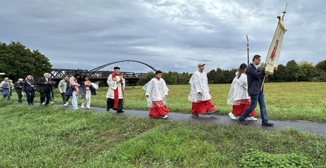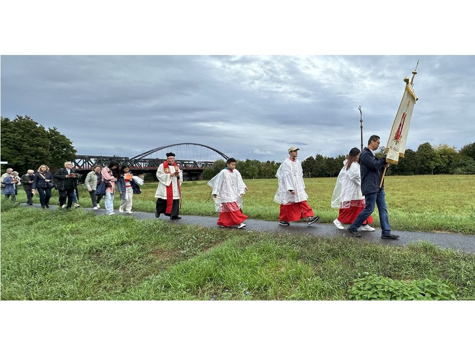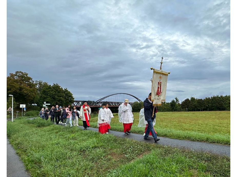 … an diesen Satz der Ermutigung erinnerte ich mich, als wir am zweiten Sonntag im September bei noch strömendem Regen zu Fuß am Main entlang von St. Elisabeth aus zum Kreuzfest nach Steinheim aufbrachen. Zum ersten Mal hatte ich diesen Satz vor vielen Jahren auf einer Radtour als Student von Fulda nach Taize von einem Pater in Frankreich gehört. Nach der Übernachtung im Kloster gab er unserer Gruppe zum Reisesegen beim Start in strömendem Regen diesen Satz mit auf den Weg.