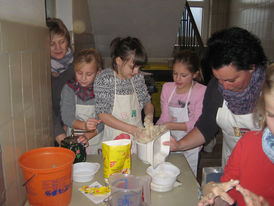 Nach einem Begrüßungslied ging es für die jungen Bäcker auch schon los: Unter Anleitung von Pia Dorn (die uns auch den Backofen erklärte) wurden Brote geformt, gesegnet und schließlich von jedem Kind das eigene Brot bewässert und in den Backofen geschoben.