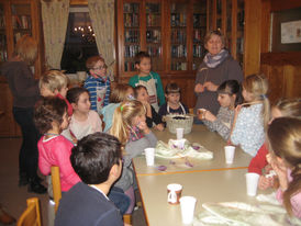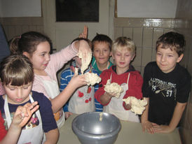 In der Zwischenzeit machten wir unter der Anleitung der Katecheten einen eigenen Teig. Zuerst wurden Körner zu Mehl gemahlen und dann geknetet, geknetet, geknetet. Bei einer Teepause in der Bücherei wurden Samen in einem Blumentopf gepflanzt und die Entstehung des Kornes erklärt.