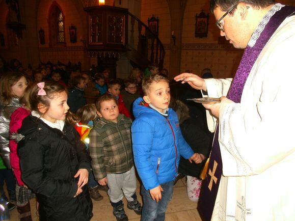 Pfarrer Clobes spendete allen Kindern, Erzieherinnen und anwesenden Gläubigen das Aschenkreuzwelches die Kinder mit Stolz trugen und ihre Verbundenheit mit Gott zeigten.