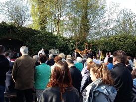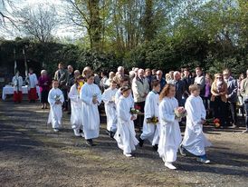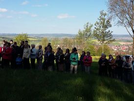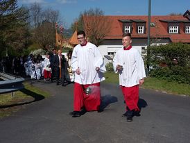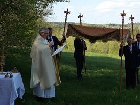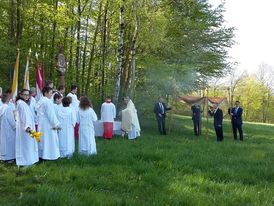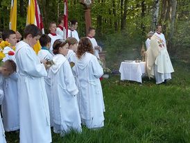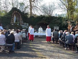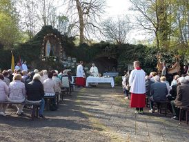 „Bei einem Wetter wie es schöner nicht sein kann“ begrüßte Pfarrer Axt viele Gläubige zur Heiligen Messe an der Mariengrotte in Mittelkalbach. Ausgehend von den „Fußabdrücken“, die Jesu vor seiner Himmelfahrt in Jerusalem hinterlassen haben soll, hat Pfarrer Axt in seiner Predigt an einigen Beispielen erläutert, wo die Spuren Jesu in unserem Leben erkennbar werden.
