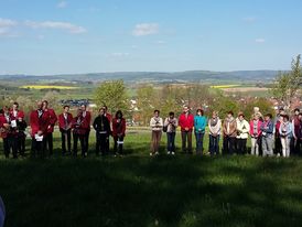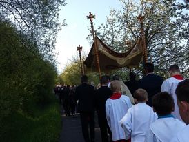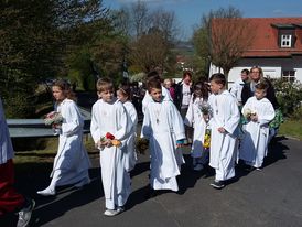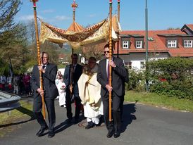 Die Kalbachtaler, die bereits den Gottesdienst musikalisch gestaltet hatten, begleiteten im Anschluss zusammen mit den diesjährigen Kommunionkindern und den teilnehmenden Gemeindemitgliedern die Heilige Eucharistie in einer Prozession durch die „Flur“ zur Pflanzenröde. Nach einer kurzen Andacht dort am Bildstock mit Fürbitten für die Bewahrung der Schöpfung, die Früchte des Feldes sowie Frieden und Arbeit spendete Pfarrer Axt den Eucharistischen Segen. Neben diesem Segen haben das üppig frische Grün, die erblühte Natur und die beeindruckende Aussicht auf das Kalbachtal dazu bei getragen, dass ich gestärkt nach Hause gehen konnte.