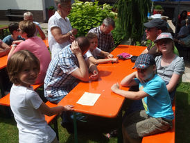 Wenn man lange an der frischen Luft ist, bekommt man Hunger. Und so waren wir froh, nach der Messe im Garten der Gaststätte „Zum Taufstein“ am Sparhof einkehren zu können. Familie Aland hatte für uns eine Speisekarte zusammengestellt, auf der sogar ein extra für diesen Tag gemachter Eintopf stand – der Kiliansteller: ein „Irish Stew“. Bei dem warmen Sonnenschein zischten die kühlen Getränke, schmeckten die leckeren Gerichte und hörte man viele gute Gespräche und so manchen Lacher. Herzlichen Dank an Familie Aland für die gute und freundliche Bewirtung!