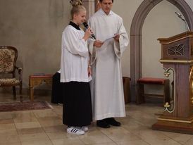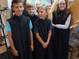 In den Messdienerstunden wurden die sechs durch Herrn Stephan Schilling und Sophie Pörtner angelernt. Sie mussten die unterschiedlichen Dienste üben und erlernen: Wie sammelt ein Messdiener die Kollekte ein? Wie mache ich eine richtige Kniebeuge vor dem Tabernakel oder im Altarraum? Wie und wann wird zur Wandlung geschellt bzw. gegongt? Wie trägt man ein Vortragekreuz und eine Fahne? Wie geht das mit der Gabenbereitung und dem Schlussdienst? Diese Dienste wurden immer wieder geübt bis es dann soweit war.