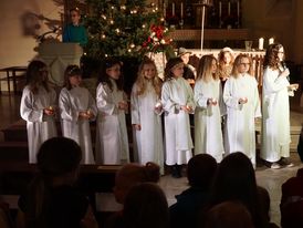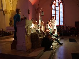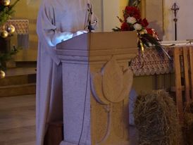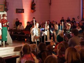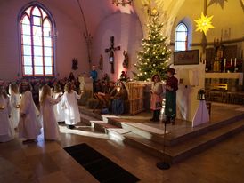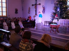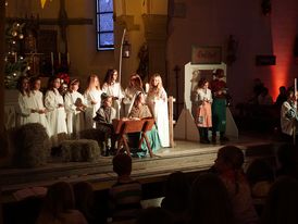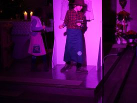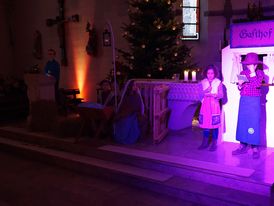 Die Gastwirte im Gasthaus erzählten die Geschichten von Maria und Josef - Sie hatten keinen Platz in ihrem Gasthaus. Maria und Josef kamen durch den Mittelgang und suchten eine Bleibe für die bevorstehende Geburt ihres Kindes "Jesus". Sie fanden nur einen einen Stall mit Stroh und einer Krippe. In der Nähe lagerten die Hirten auf dem Feld mit ihren Schafen - sie sahen ein helles Licht am Himmel und die vielen Engel brachten die Frohe Botschaft von der Geburt Jesu.