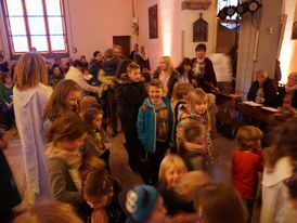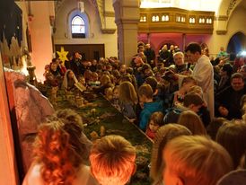 Nach dem Krippenspiel zogen die anwesenden Kinder durch den Mittelgang der Kirche zur Krippe. Sie fanden Maria, Josef und das Jesuskind, das in der Krippe lag. Die Hirten hatten sich um den Stall versammelt und hielten inne. An der Krippe wurden die Führbitten gelesen für uns und für alle Menschen auf dieser Erde.