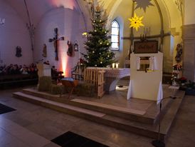 Am Nachmittag des Heiligabend kam viele Familien aus ganz Kalbach in die Kirche St. Laurentius zur Krippenfeier, die von Pastoralreferent Stephan Schilling zelebriert wurde. Die Kirche war in gelb, rotes Licht getaucht und vor dem Altar war ein Gasthaus und der Stall in dem Jesus zur Welt kommen sollte aufgebaut. Das Bühnenbild und die beleuchtete Kirche brachte die richtige Atmosphäre in der Kirche für die Krippenfeier.
