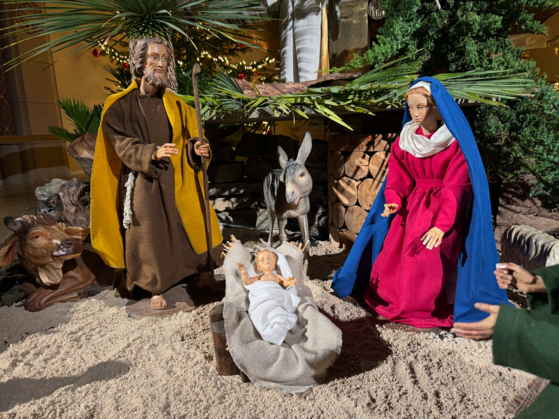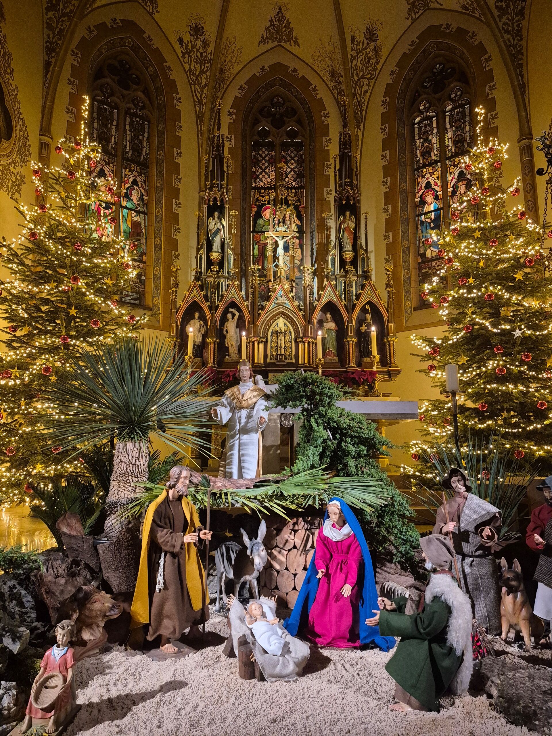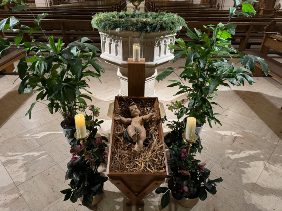 Seit Dezember 2021 wird die Krippenlandschaft mit ihren verscheiden Darstellung vor dem neuen Altar im Altarraum aufgebaut. Als Ergänzung steht vor dem Taufstein im hinteren Bereich der Kirche, für die Kirchenbesucher, eine große Krippe, in die in der Heiligen Nacht das Jesuskind hineinlegt, wird. Diese kleine Darstellung, mit dem Friedenslicht aus der Geburtsgrotte in Bethlehem, rundet das weihnachtliche Geschehen in unserer Pfarrkirche ab.