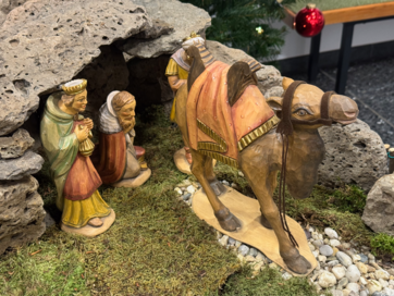 Auch die drei Heiligen Könige aus dem Morgenland sind bereits auf dem Weg; diese Szene ist im unteren rechten Bereich der Landschaft zu sehen. Die Krippenlandschaft zählt 23 Tier- und Menschenfiguren; sie sind 22 cm groß und bunt gefasst.