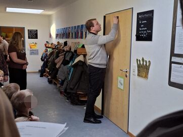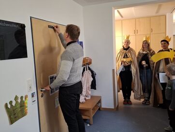 Nachdem die Sternsinger einiges über den beschwerlichen Weg, über das Leben in deren Alltag und über das Entdecken und Nachforschen des besonderen Sterns berichtet hatten, schrieb Kaplan Schöppner den Segen an die Türen der Gruppenräume. Auf kindgerechte und gut verständliche Weise erzählte Kaplan Schöppner den Kindern die Geschichte der Geburt Jesu bis zum Besuch der drei Heiligen Könige am Stall – über das Besondere der mitgebrachten Geschenke, Gold – Weihrauch und Myrrhe und über das Geschenk des Segens für unsere Häuser.
