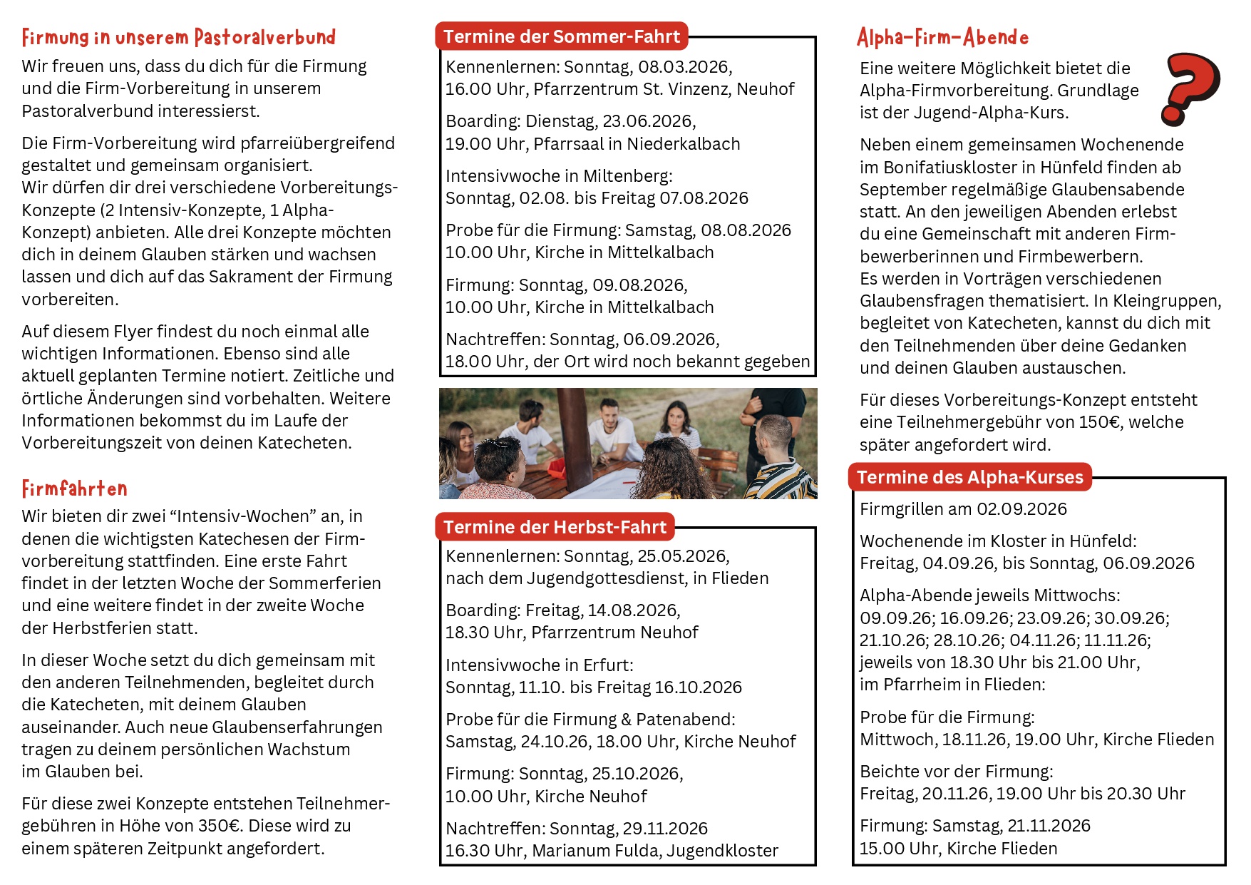 Bei der Anmeldung kannst du Prioritäten angeben, an welcher Firmvorbereitung du teilnehmen möchtest. Wir werden uns innerhalb einer Woche bei dir melden, ob wir deiner Wahl entsprechen können.