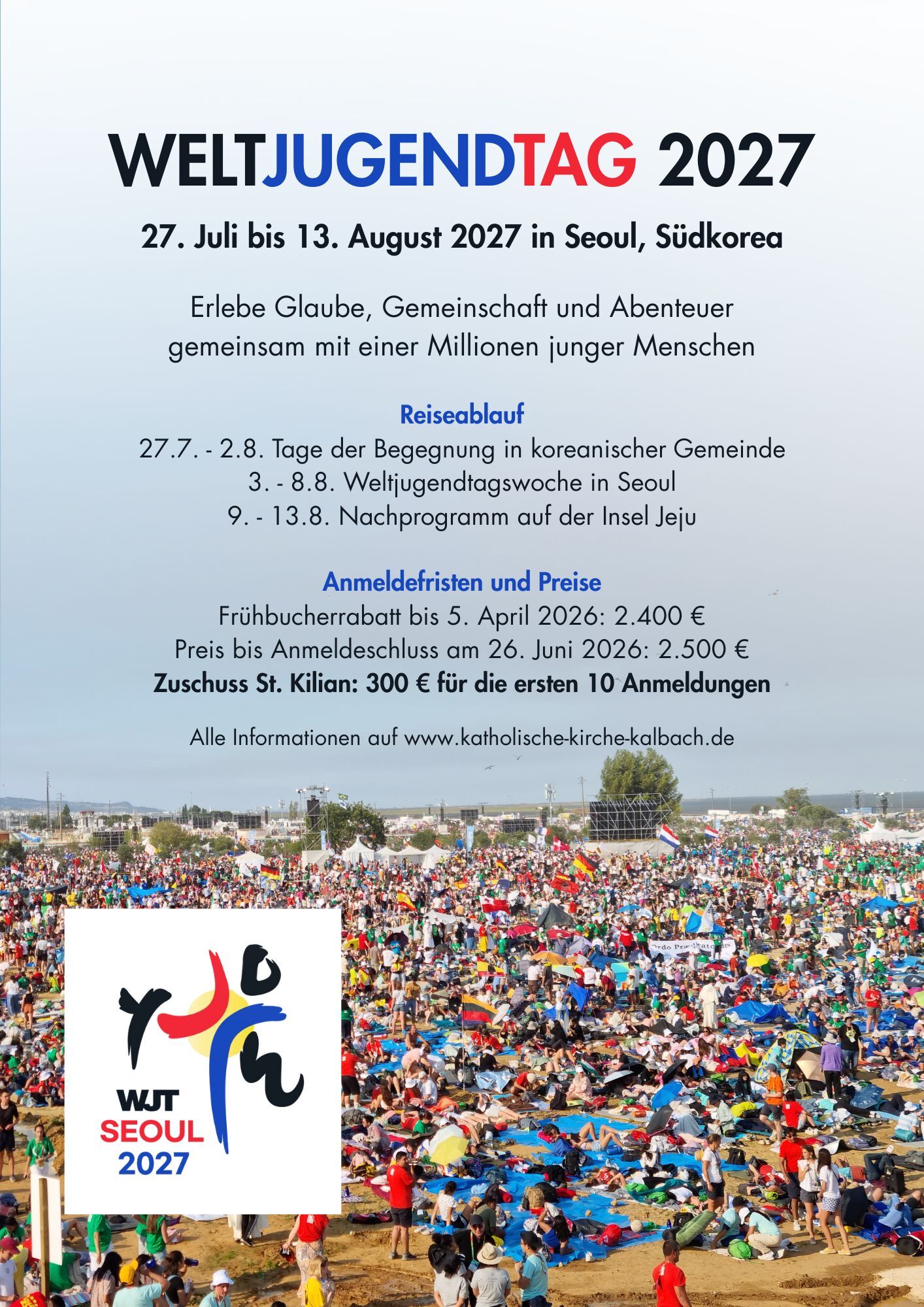 Wir wissen, dass der Weltjugendtag für viele Familien nicht einfach zu finanzieren ist. Daher möchten wir finanziell unterstützen: Bis zu 10 Kalbacher erhalten von unserer Pfarrei eine Unterstützung in Höhe von 300 € pro Person. Fülle dafür einfach nachfolgendes Formular aus (du musst dafür noch nicht offiziell angemeldet sein; eine offizielle Anmeldung über den Link oben ist aber für die Auszahlung des Zuschusses notwendig).