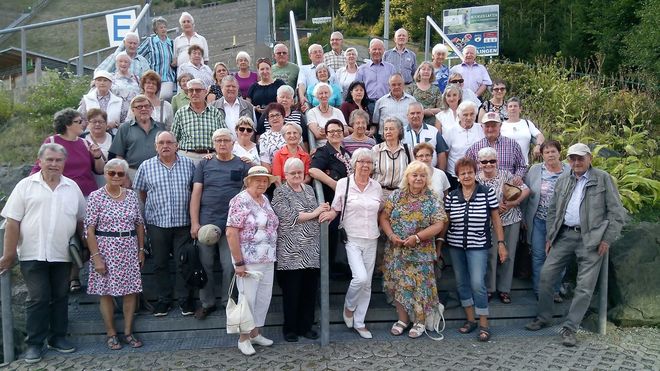 Das Bild zeigt den Melsunger Kirchenchor unter der Leitung von Alwin Langstein neben der weltberühmten Mühlenkopfschanze in Willingen. Die Reisegruppe umfasste 73 Personen. Ziel des diesjährigen Ausflugs war zunächst die einzige Hansestadt Hessens, nämlich Korbach, wo die Hl. Messe in der großen und sehr schönen St. Josef-Kirche mitgestaltet wurde. Die Tour führte dann weiter nach Willingen im Hochsauerland. Mit der Gondel ging es hoch zum Ettelsberg. Von dort aus wurde ein gemütlicher Spaziergang an der Hüttenalm und am Ettelsbergsee vorbei zu der Mühlenkopfschanze gestartet. Ein anderer Teil der Gruppe erlebte einen wunderbaren Tag auf der Willinger„Flaniermeile“.
