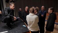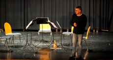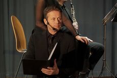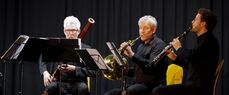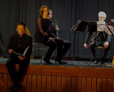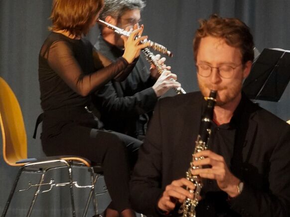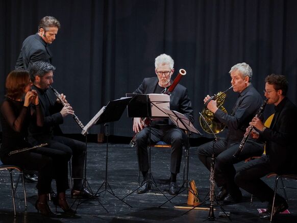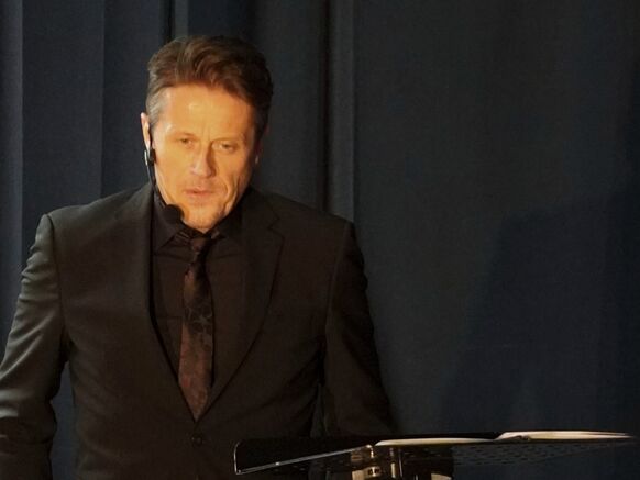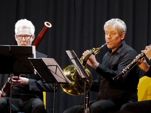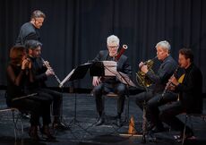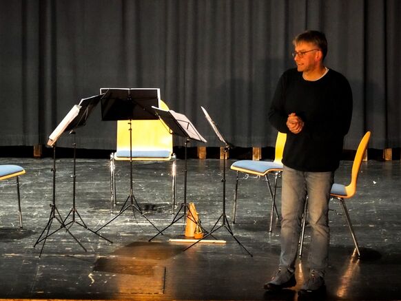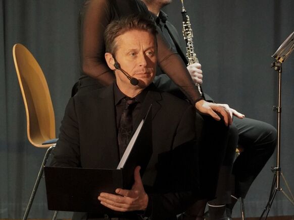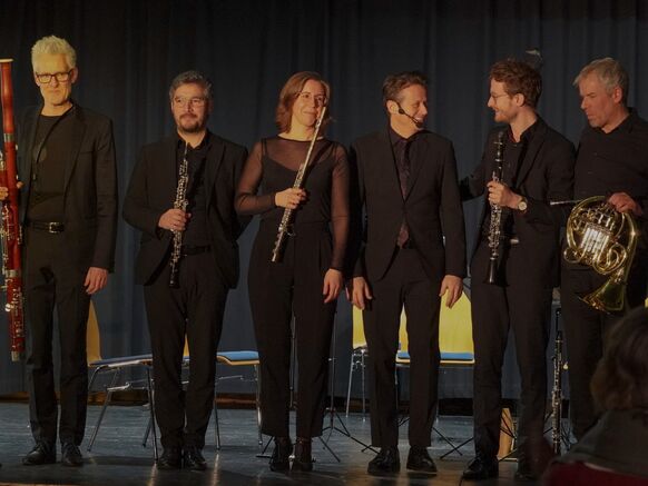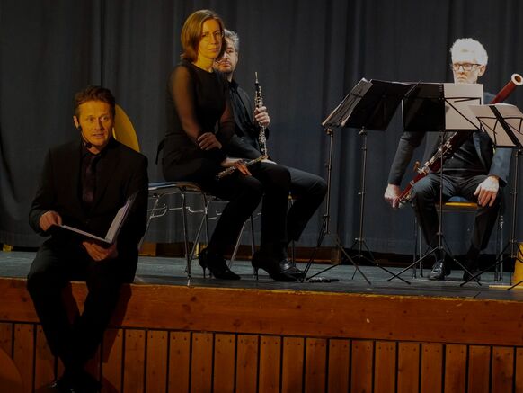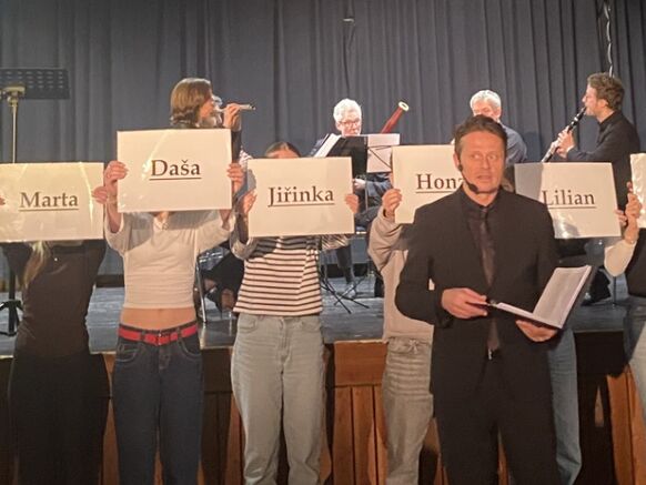 Trotz Schnee und Eis konnten die Besucherinnen und Besucher am Donnerstag, 29. Januar, in der Aula der Stiftsschule einen besonderen Konzertabend erleben. Unter dem Titel „Ich wand‘re durch Theresienstadt …“ nahm das Bläserquintett OPUS 45 zusammen mit dem bekannten Schauspieler Roman Knižka die Zuschauenden mit auf eine eindrucksvolle Auseinandersetzung mit der Geschichte der im Ghetto Theresienstadt inhaftierten Kinder und Jugendlichen.