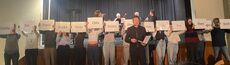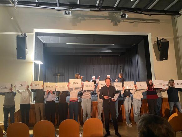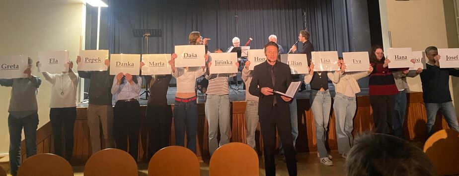 Ein besonders bewegender Moment entstand, als Schülerinnen und Schüler aus den Kursen Darstellendes Spiel und dem Deutsch-Leistungskurs der Jahrgangsstufe Q2 plötzlich aus dem Publikum aufstanden und in die Rolle der Kinder des historischen Premierenchors in Theresienstadt schlüpften. Dies hatten sie in einer 1-stündigen Probe unmittelbar vor dem Konzert unter der Leitung von Roman Knižka eingeübt. Der Moment, in dem die Jugendlichen die Namenskarten jener Kinder hochhielten, erzeugte ein stilles Bild, das sicherlich weit über den Konzertabend hinaus wirkt.