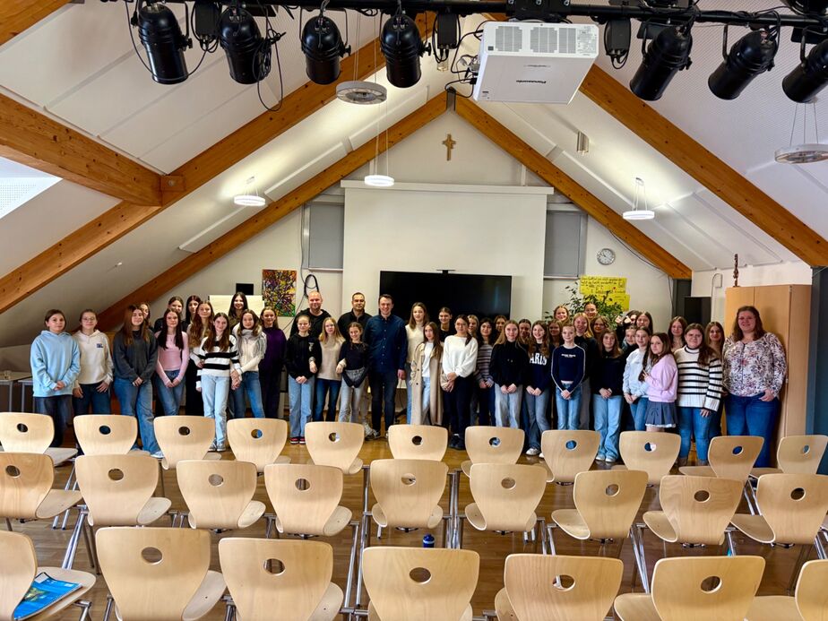 Pascal Reddig diskutiert mit Schülerinnen (8a und 8b) der Mädchenrealschule St. Josef
