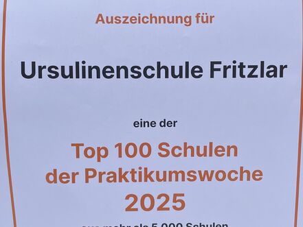 Die Praktikumswoche hat die Schulen mit den höchsten Teilnehmerzahlen prämiert – und die Ursulinenschule gehört in diesem Jahr zu den Top 100. Die Auswahl erfolgte aus über 5.000 Schulen in ganz Deutschland, deren Schülerinnen und Schüler an der Praktikumswoche teilgenommen haben.
