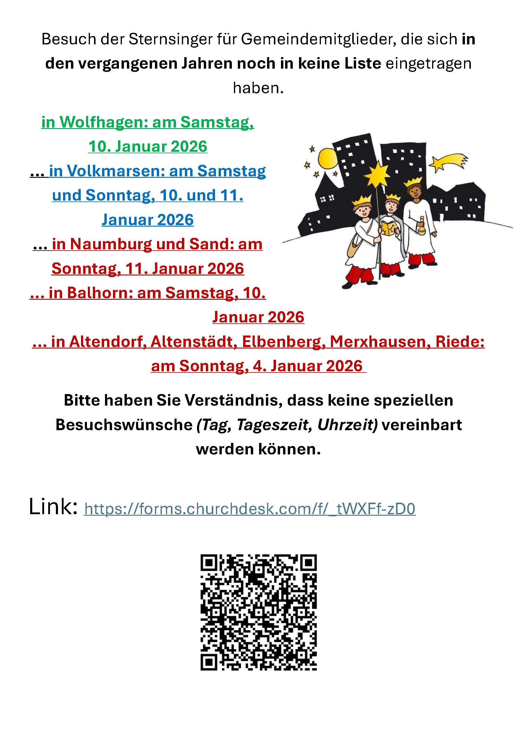 Sie wünschen den Besuch der Sternsinger? Dann melden Sie sich bitte über den nachfolgenden Link an. Haushalte, die im vergangenen Jahr auf der Liste standen, werden automatisch in diesem Jahr wieder besucht.
