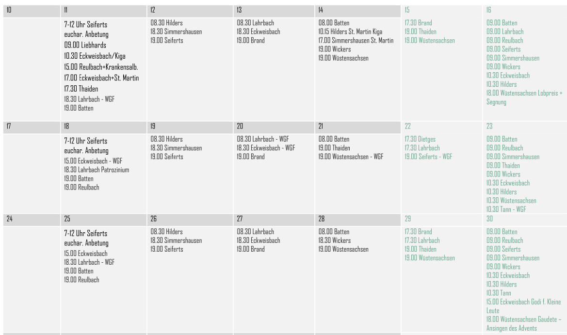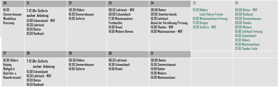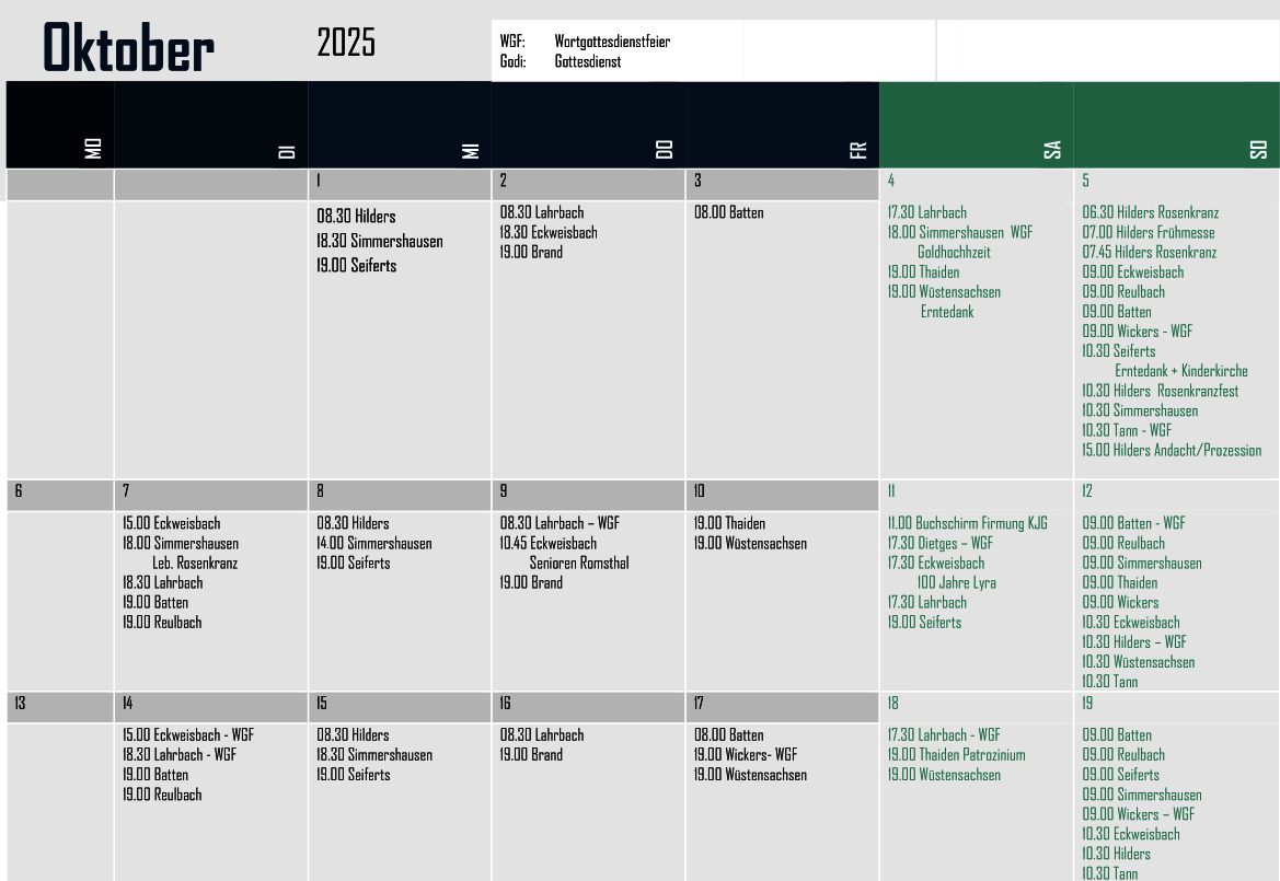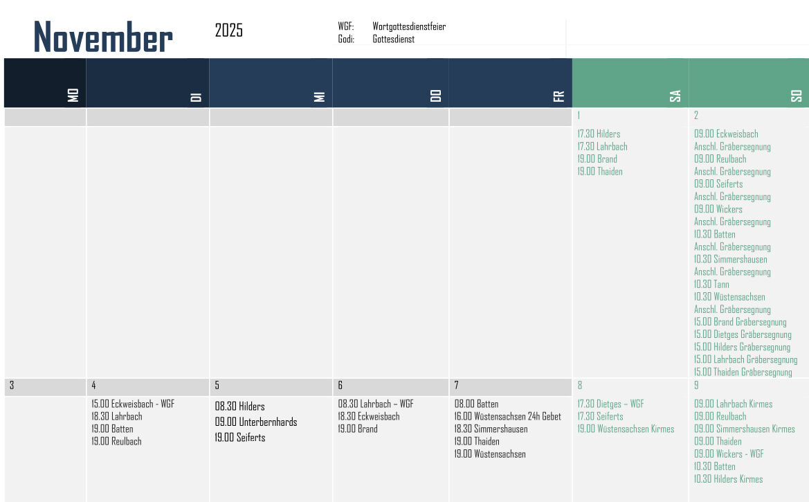 Der folgenden Aufstellung können Sie entnehmen, wann in den einzelnen Orten im Pastoralverbund Gottesdienste gefeiert werden.